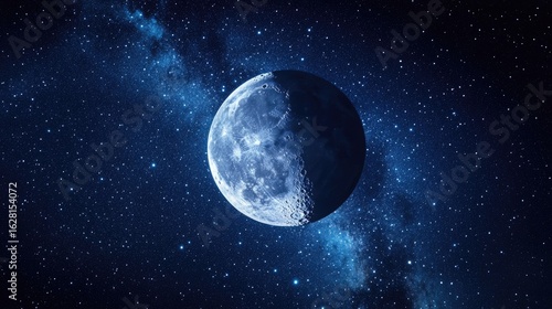 Tranquil scene of the moon high in the night sky, framed by countless stars and a faint Milky Way glow