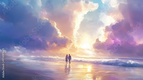 Tranquil Serenity - Pastel Illustration of Couple Walking Hand in Hand on Beach Surrounded by Clouds and Waves