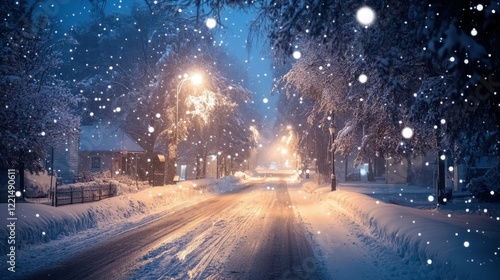Tranquil snowy night street scene with falling snowflakes and illuminated trees