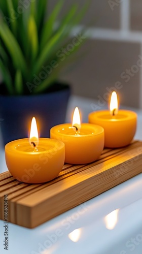 Tranquil Spa Setting Three Burning Amber Candles on Wooden Holder