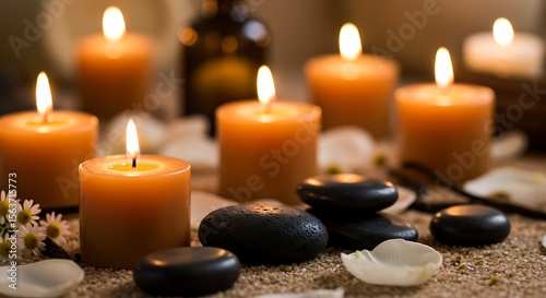 Tranquil Spa Setting with Candles, Stones, and Natural Elements for Relaxation and Serenity