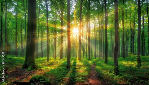 Tranquil sunlight through lush green forest canopy, creating serene picturesque scene