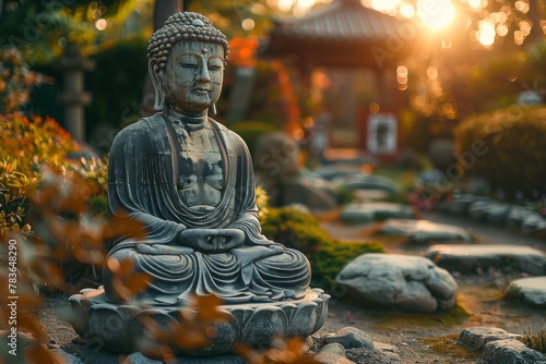 Tranquil Sunrise in Zen Garden with Buddha Statue, Creating an Atmosphere of Peace and Meditation.