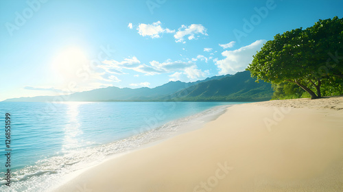 Tranquil Tropical Beach Scene with Azure Ocean and Bright Sunlight