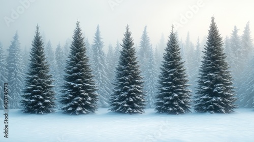 Tranquil, wintry scene with snow-covered fir trees standing tall in a silent, misty forest on a cold winter day