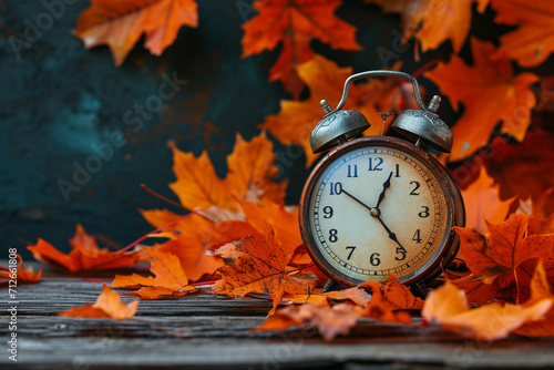 Transition into Autumn with Daylight Saving Time concept. Alarm clock and orange leaves on wooden table symbolize fall, marking the shift as winter approaches.