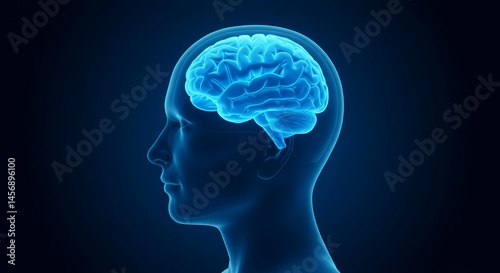 Translucent Blue Human Head with Visible Brain Side View Against Dark Blue Background