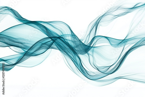 Translucent teal fabric waves flowing gracefully against white background, creating sense of movement and elegance. soft textures evoke calming atmosphere