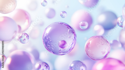 Transparent and translucent pink-purple spheres float in a light blue gradient background, creating a serene and minimalist aesthetic.