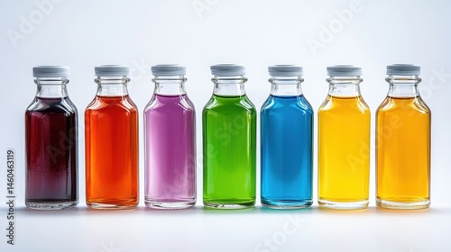 Transparent bottles with colorful fluids arranged symmetrically against a pure white backdrop