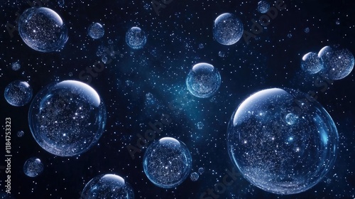 Transparent bubbles filled with glitter particles against a starry night sky, sparkling and enchanting, colorful bubbles, cosmic dream