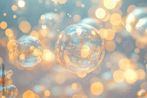Transparent bubbles float amidst a dreamy bokeh of golden and blue lights, creating a magical, ethereal scene.