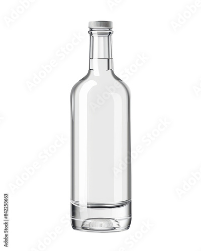 Transparent empty glass bottle with a sleek design, perfect for beverages or as a decorative piece. Photographed on a plain background.