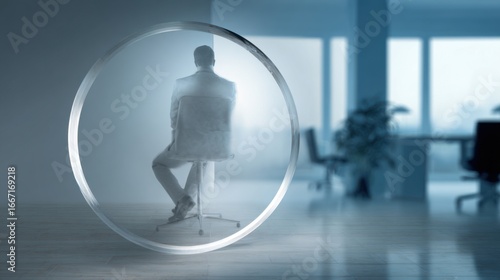 Transparent figure of a businessman sitting on an office chair inside a transparent bubble, with a blurred background, in a light blue color scheme, minimalist interior style, stock photo.