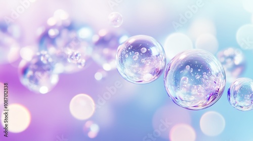 Transparent glass balls forming an abstract shape with a light purple and light blue gradient background.