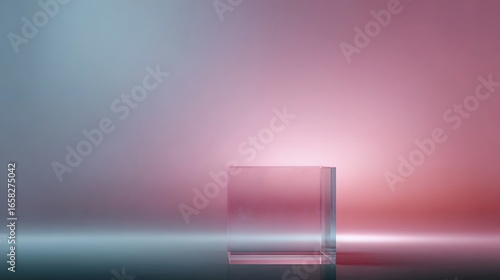 Transparent glass podium over soft gradient background with studio lighting and sharp focus