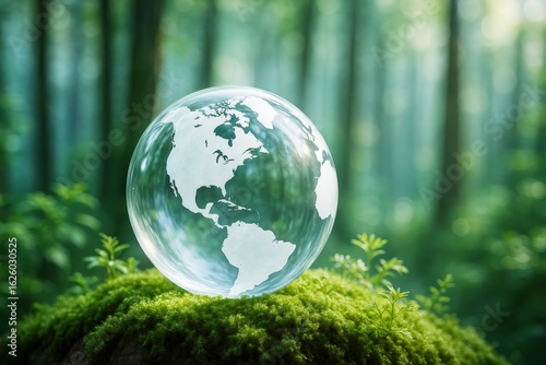 Transparent globe with North and South America on moss in forest, symbolizing eco-friendly Earth and sustainability concept in sunlight.