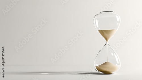 Transparent hourglass with light-colored sand flowing slowly, minimalistic design on solid background, symbolic time concept.