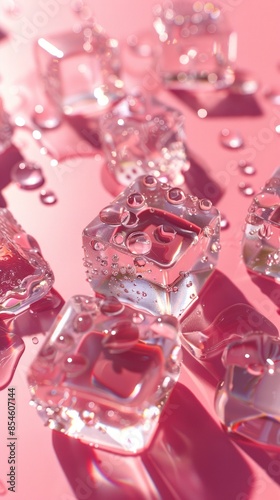 Transparent ice cubes with water drops on a vibrant pink background, a fresh and cool closeup.