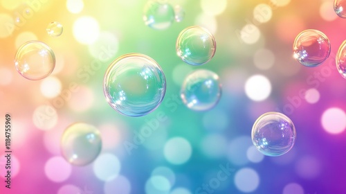 Transparent spheres in vivid rainbow colors floating on a soft gradient pastel background, mesmerizing and dreamy, colorful bubbles, abstract art