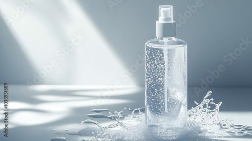 Transparent spray bottle with water droplets on a white background, highlighting freshness and hydration.