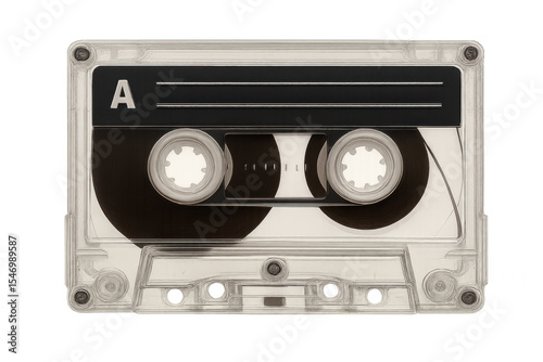 Transparent vintage audio cassette displaying analog music media against clean background, symbolizing nostalgic audio technology era