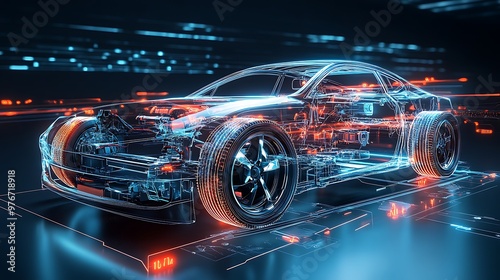 Transparent Wireframe of a Modern Car with Illuminated Details