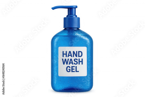 Transparent-backed hand sanitizer bottle, blue plastic container featuring water droplets covering sleek dispenser pump surface
