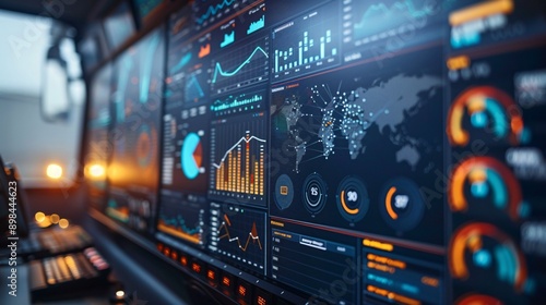 Transportation and delivery monitor room. Tracking AI and automatic robotic for transport packages in delivery business.