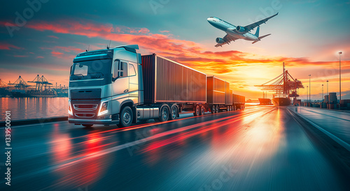 Transportation and logistics concept at sunset, Container truck and airplane on port background, Global freight and cargo delivery, Multimodal shipping infrastructure