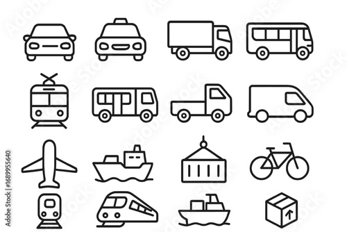 Transportation and logistics outline icon set. Vector collection of line symbols for transit, shipping, and delivery. Includes car, truck, bus, train, ship, and plane icons.