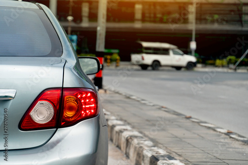 Transportation of silver car on the road. Open light brake waiting connect the front car queue to make a U-turn.