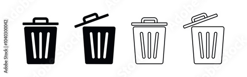 Trash Bin Vector Flat Black Icon on White Background. Solid and Linear Delete Symbol, Recycle Bin, Rubbish, Garbage.