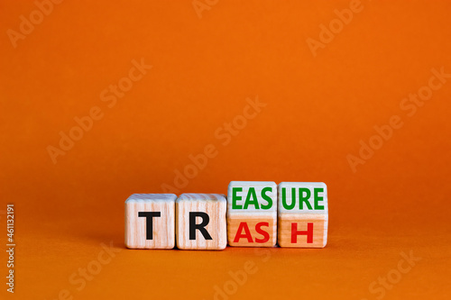 Trash to treasure symbol. Businessman turned cubes and changed the word trash to treasure. Beautiful orange table, orange background. Business, trash to treasure concept. Copy space.