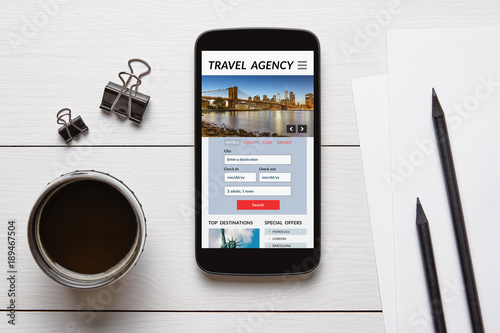 Travel agency concept on smart phone screen with office objects on white wooden table. All screen content is designed by me. Flat lay