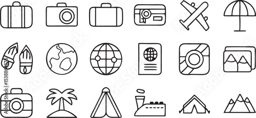 Travel and Tourism Icon Set Solid Black Vector with Suitcase Passport Elements