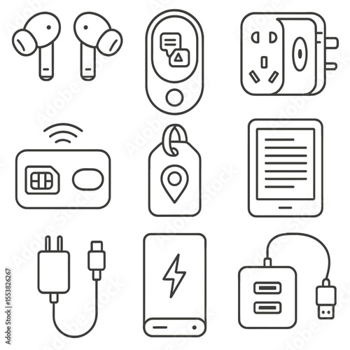 Travel Electronics Icons. Outline style icons of Travel Electronics: noise-canceling earbuds, portable translator, travel power