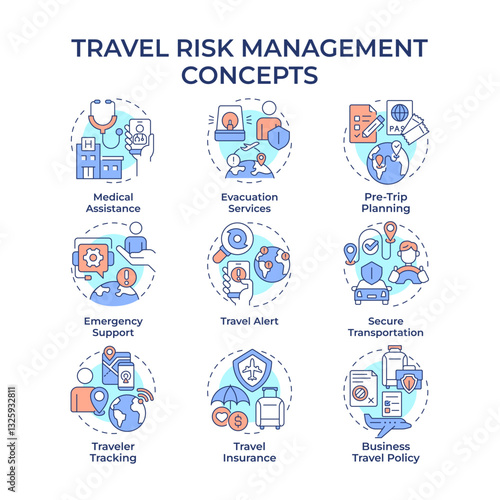 Travel risk management multi color concept icons. Business journey security service. Tourist insurance policy. Icon pack. Vector images. Round shape illustrations for presentation. Abstract idea