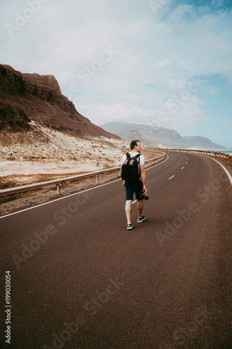 Traveler walks in the center of an epic winding road. Huge volcanic mountains in the distance behind him. Sao Vicente Cape Verde