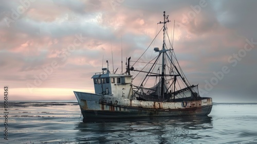 Trawler: Fishing Boat with Mesh, Mast, and Hull on Coastline