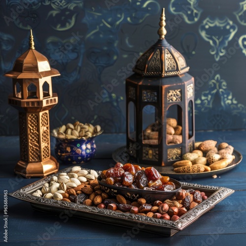 Trays filled with dates nuts beside a wooden mosque-shaped lantern on a dark blue table, reflecting