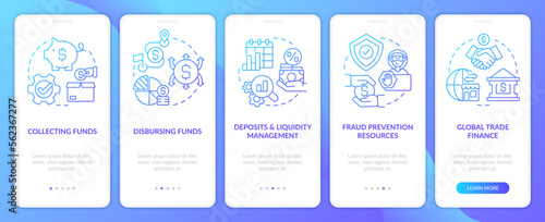 Treasury management services blue gradient onboarding mobile app screen. Walkthrough 5 steps graphic instructions with linear concepts. UI, UX, GUI template. Myriad Pro-Bold, Regular fonts used