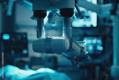 Treatment Concept A hightech operating room with robotic surgeons and laser treatments, presenting an ultramodern, supernatural scene, banner, with copy space