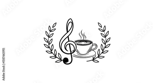 Treble clef and steaming cup of coffee, framed by laurel branches, in a black and white illustration.