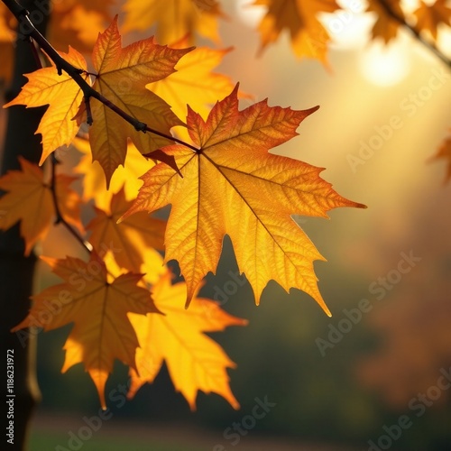 tree branch with yellow and brown leaves against a warm golden light, fall, brown, branches