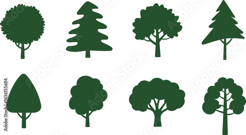 Tree silhouette icon set, stylized shapes, dark green design, nature graphic, simple layout