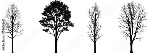 Tree silhouette vector illustration, seasonal tree set, bare branches design, leafy tree icon, forest contrast artwork, black white image, cad style, nature shape sketch, minimal tree profile