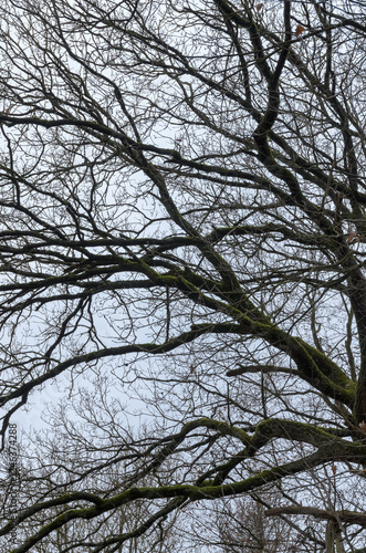 Tree silhouette with bare branches and twigs in a forest against bright sky during winter season, vertical natural abstract trees woodland background