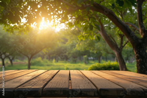 Tree Table wood Podium with farm in the background, sunlight product display mockup