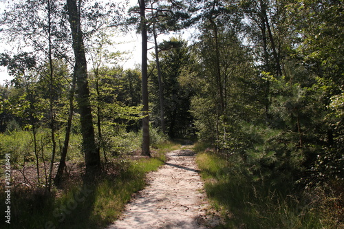 tree with green leaves and needles in the sun at the Dellen in the Veluwe in the Netherlands
